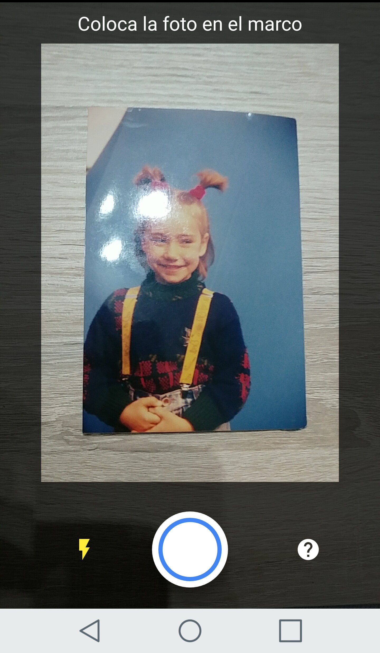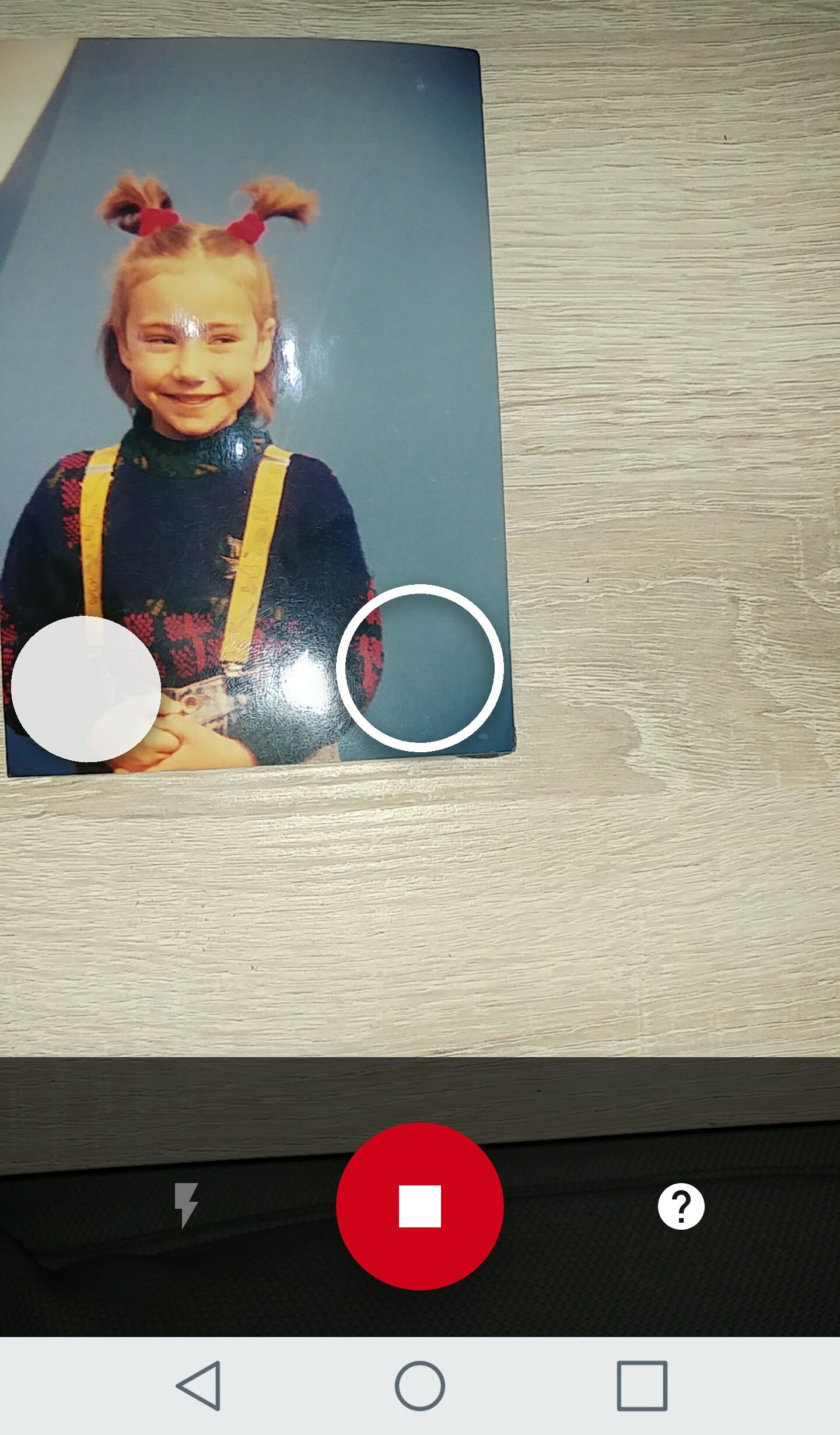 La aplicación activa el flash de nuestro Smartphone y hace una primera toma centrada de la fotografía a digitalizar. Posteriormente debemos hacer coincidir en la pantalla cuatro puntos que aparecen en cada una de las esquinas de la foto, sin dejarnos avanzar al siguiente si no está perfectamente centrado.