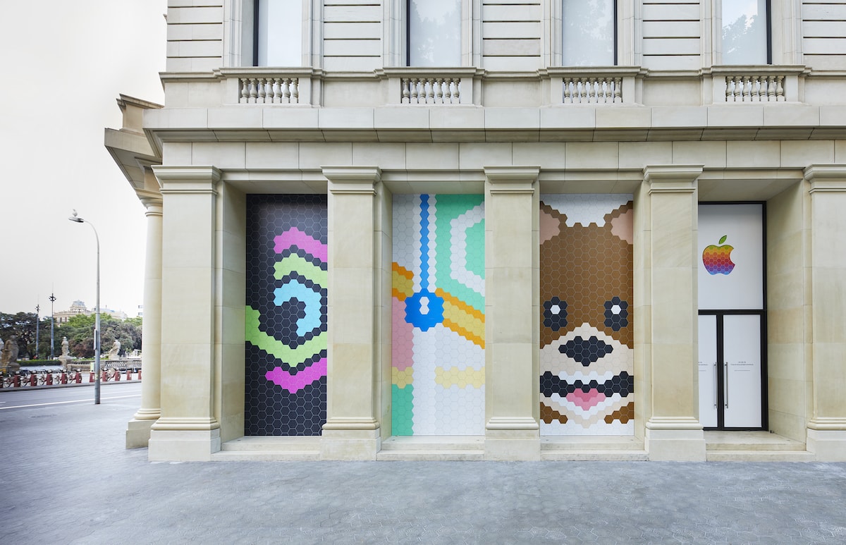 En los ventanales de la Apple Store encontramos una serie de mosaicos, haciendo alusión al estilo de Gaudí, con diferentes prestaciones que ofrece Apple en sus productos.