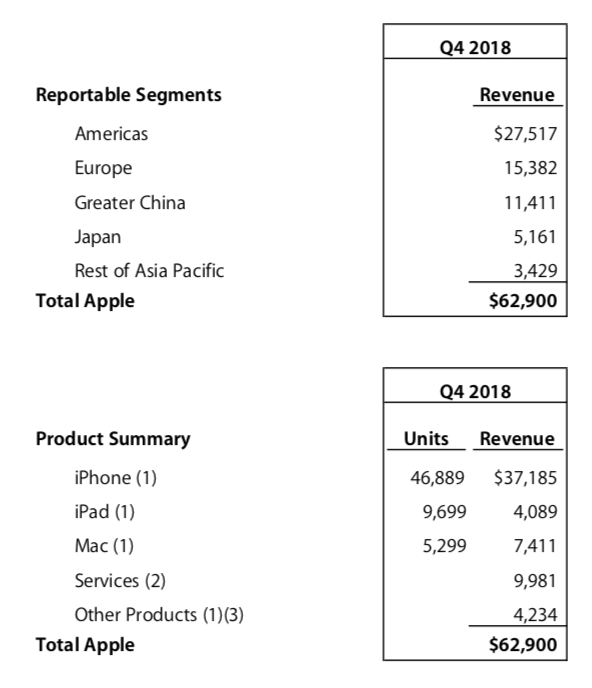 La compañía ha ofrecido unos datos estimados de lo que sería el primer trimestre de la compañía en 2019 (de septiembre a diciembre). Apple tendría unos ingresos de entre mil millones y cinco mil millones de dólares más que el primer trimestre de 2018 (de septiembre a diciembre).