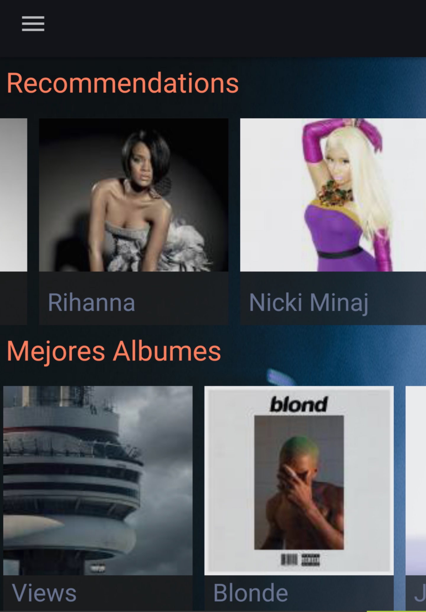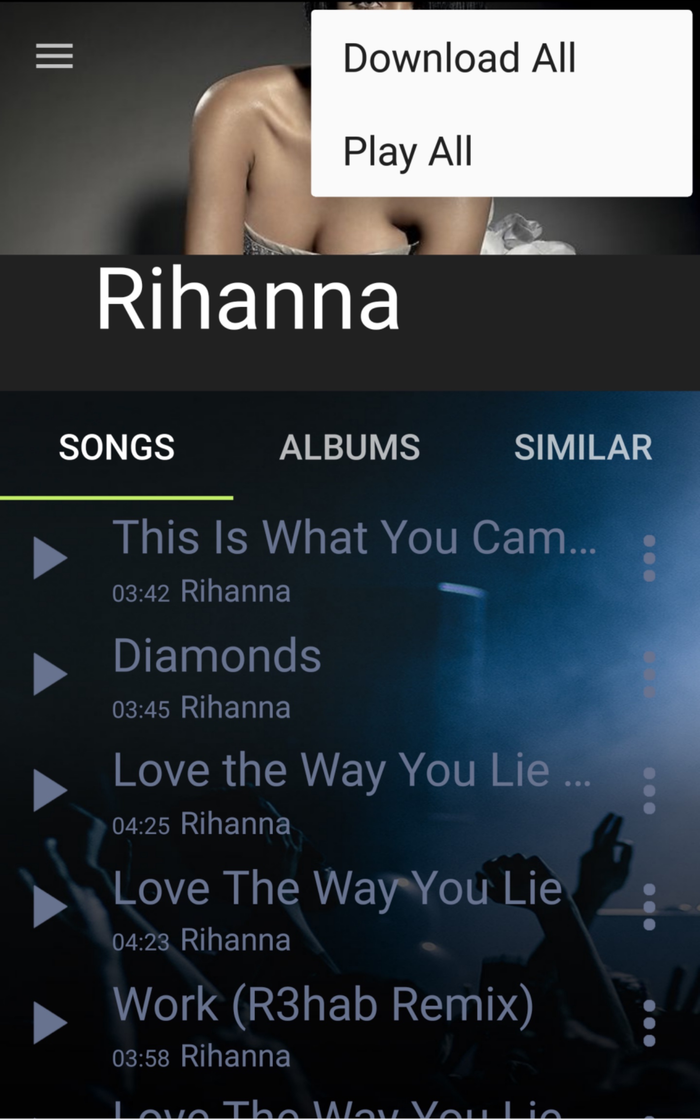 En la pantalla principal la App nos muestra los mejores álbumes, artistas, géneros y listas de NetEase. En el menú encontramos todas las opciones de la App y la barra de búsqueda. Una vez seleccionado un artista, accedemos a una playlist con las mejores canciones del mismo y podemos acceder a sus álbumes. Pulsando la pestaña de opciones en la esquina superior derecha, tendremos la opción de reproducir todas las canciones o descargar todas las canciones.