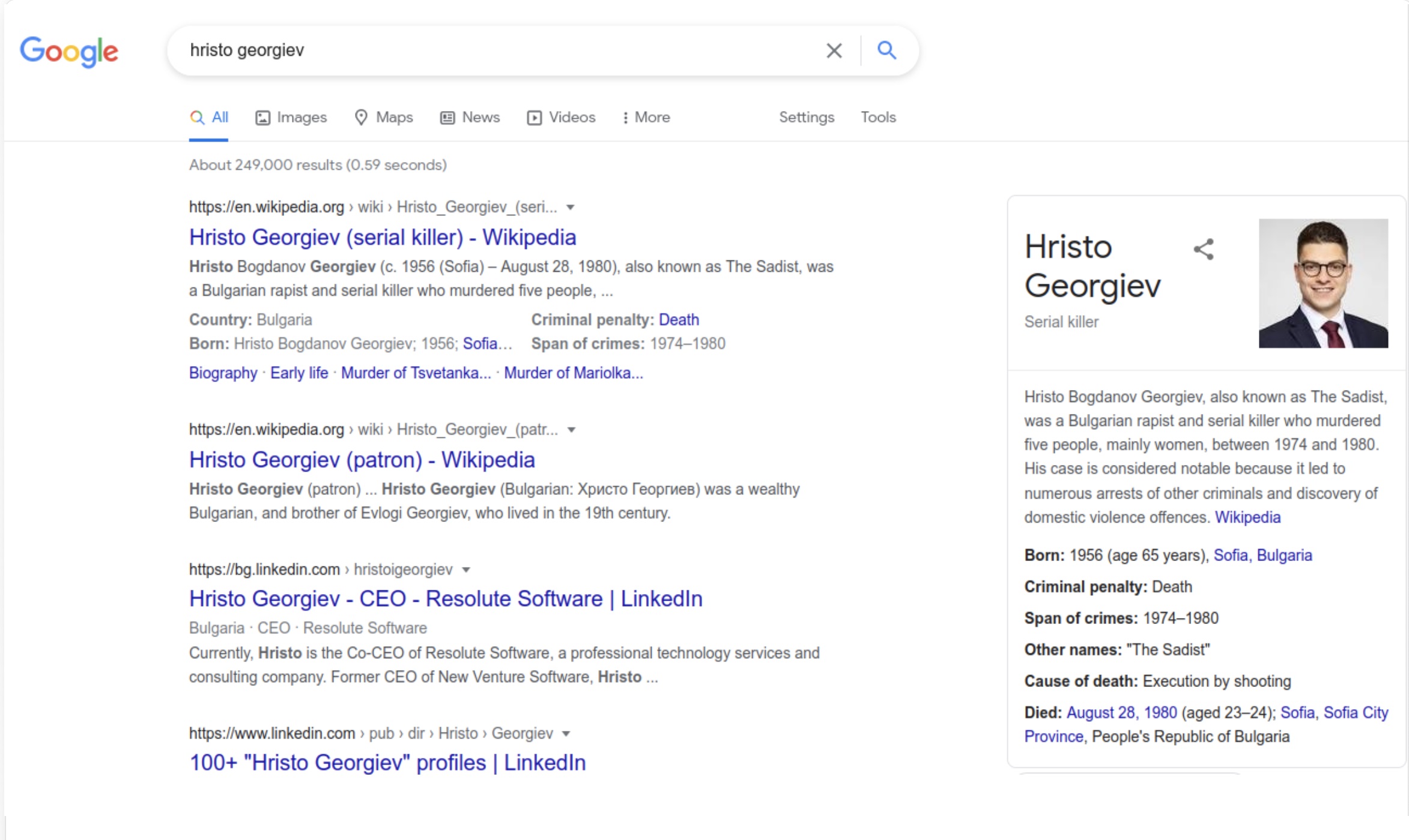 El algoritmo de Google es una IA encargada de vincular y gestionar millones de datos contenidos en la plataforma. Esto con el objetivo de ofrecer a cada búsqueda una respuesta intuitiva y acorde con la intención del usuario. Sin embargo, como si fuera una broma de mal gusto, un hombre suizo reportó como el explorador había vinculado su fotografía con un artículo de Wikipedia acerca del asesino en serie Hristo Georgiev.
