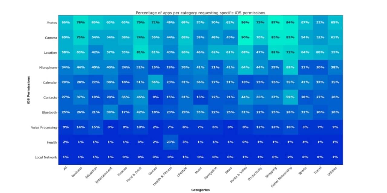 Esta información ha sido publicada por Jamf, un socio empresarial de Apple, que ha elaborado un informe dónde se muestran los permisos más solicitados por las aplicaciones de la App Store. Además, Jamf ha diseñado un gráfico en el que detalla el porcentaje de aplicaciones que requieren un permiso en concreto dentro de un campo de aplicaciones, como educación o videojuegos, por ejemplo.