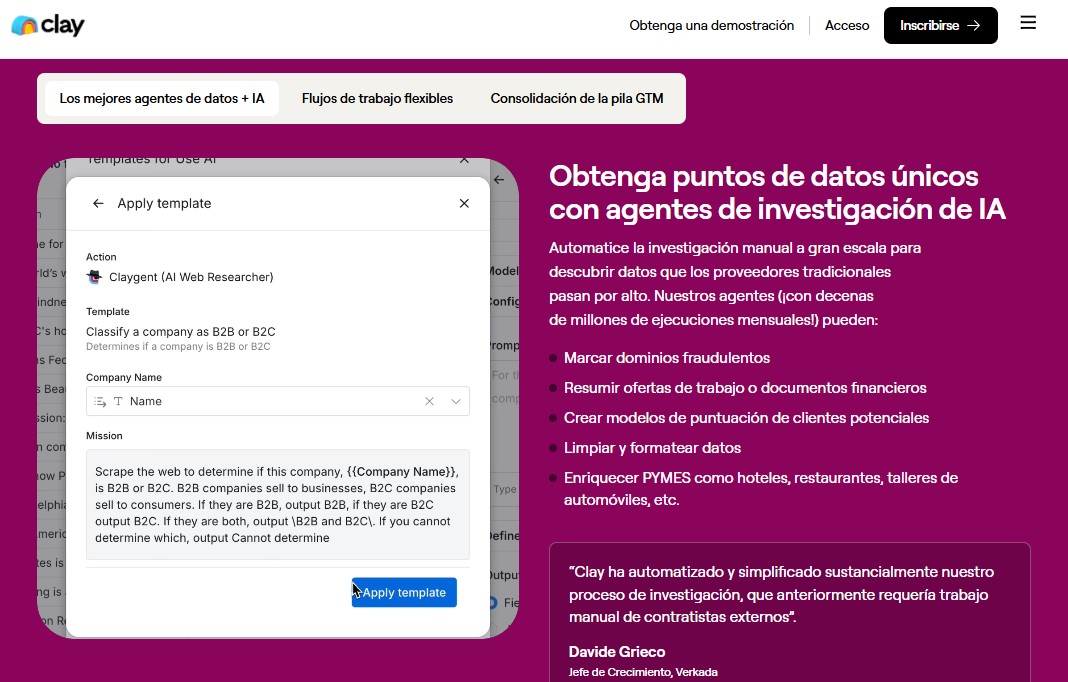 En esta etapa, Claygent, el agente de investigación basado en IA de Clay, se encarga de realizar tareas complejas de búsqueda de información en sitios web y otras fuentes digitales.