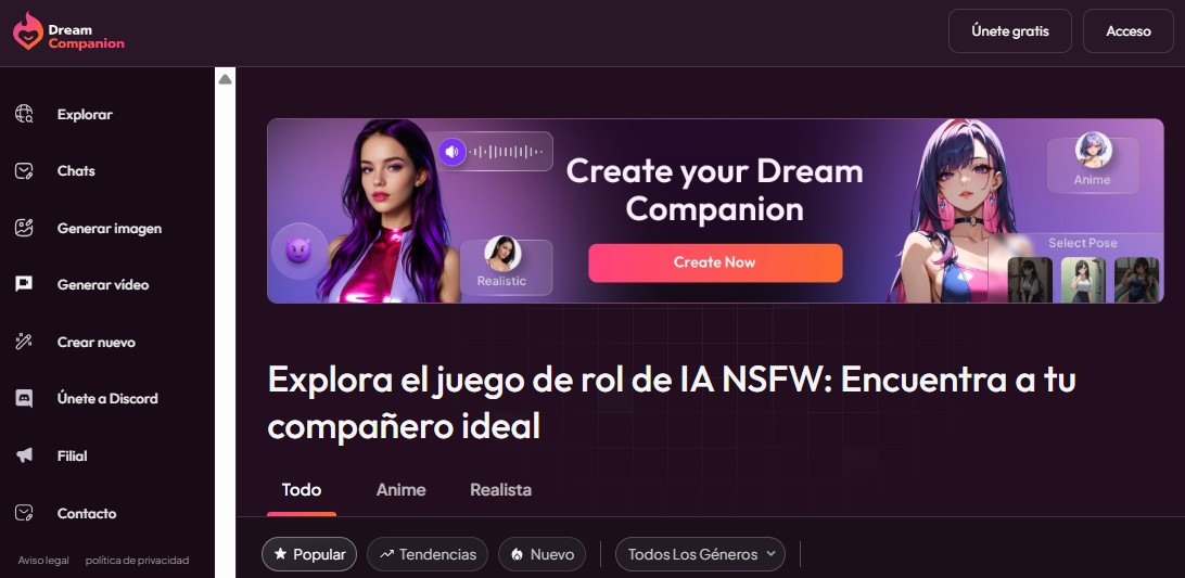 Si quieres empezar a chatear sin filtros con personajes de IA. Primero, ingresa al sitio web oficial de Dream Companion y crea una cuenta. El proceso es rápido y solo necesitas un correo electrónico válido para comenzar.