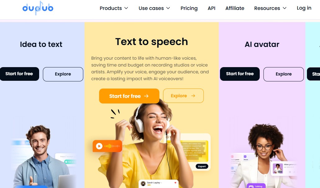 Dupdub transforma cualquier texto en audio con una selección de más de 500 voces realistas en más de 70 idiomas y acentos, ideal para narraciones, presentaciones y contenido multimedia.