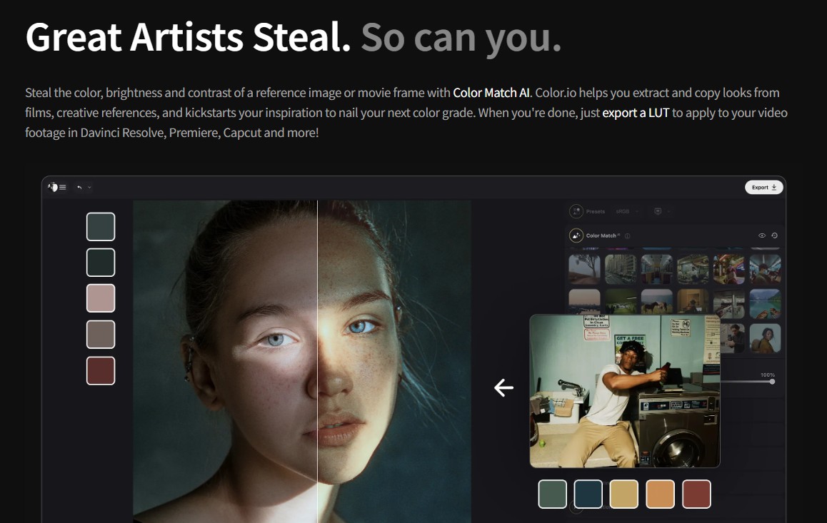 Color Match se destaca por emplear inteligencia artificial para analizar y extraer esquemas de color de cualquier imagen de referencia. Esto significa que si has visto una película, una fotografía artística o un anuncio publicitario cuyo estilo de color te encanta, puedes capturar esa misma atmósfera y aplicarla a tus propias fotos.