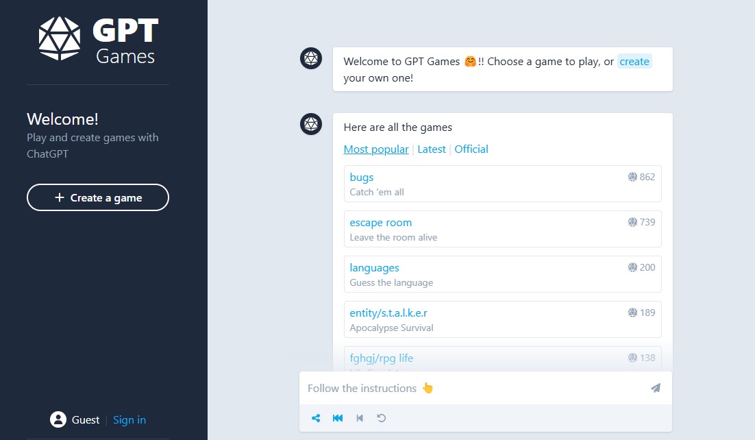 GPT Games combina herramientas de desarrollo con la potencia de ChatGPT para ofrecer una experiencia de juego única. Una de sus principales características es la capacidad de los usuarios para diseñar sus propios juegos sin requerir habilidades de programación avanzada.