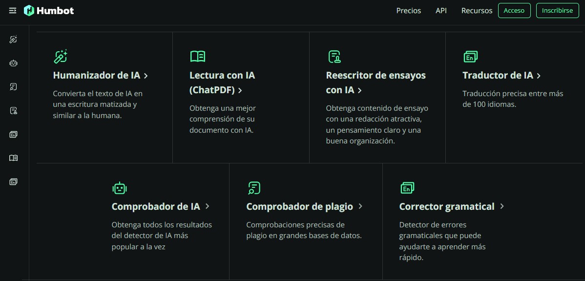 Ingresa a la página oficial de Humbot y regístrate. Puedes elegir entre un plan gratuito, que permite probar sus funciones básicas, o un plan de pago con más opciones avanzadas de reescritura.