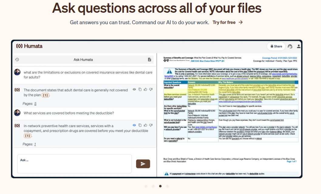 Por último, Humata incorpora un sistema de preguntas y respuestas interactivo, que permite hacer consultas específicas sobre los documentos cargados. Esto resulta especialmente útil para profesionales que deben tomar decisiones informadas basadas en datos concretos contenidos en informes previos.