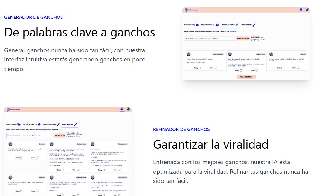Tribescaler no solo automatiza la creación de ganchos, sino que optimiza su efectividad mediante distintas herramientas diseñadas para potenciar el impacto del contenido. Por ejemplo, a partir de palabras clave proporcionadas por el usuario, la IA crea frases atractivas que captan la atención del público.
