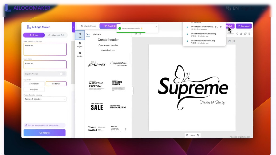 Una vez finalizado el diseño, Logo Maker permite exportar el logo en diferentes formatos de alta resolución, como SVG para gráficos escalables o PNG para medios digitales.