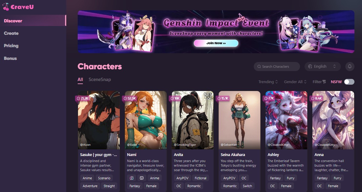 La personalización también es otro pilar fundamental de CraveU. Los usuarios pueden elegir entre diversos personajes, cada uno con estilos, voces y personalidades diferentes. Pero la experiencia no termina ahí: es posible ajustar elementos específicos del personaje, desde su apariencia hasta sus preferencias de conversación y estilo de respuesta.