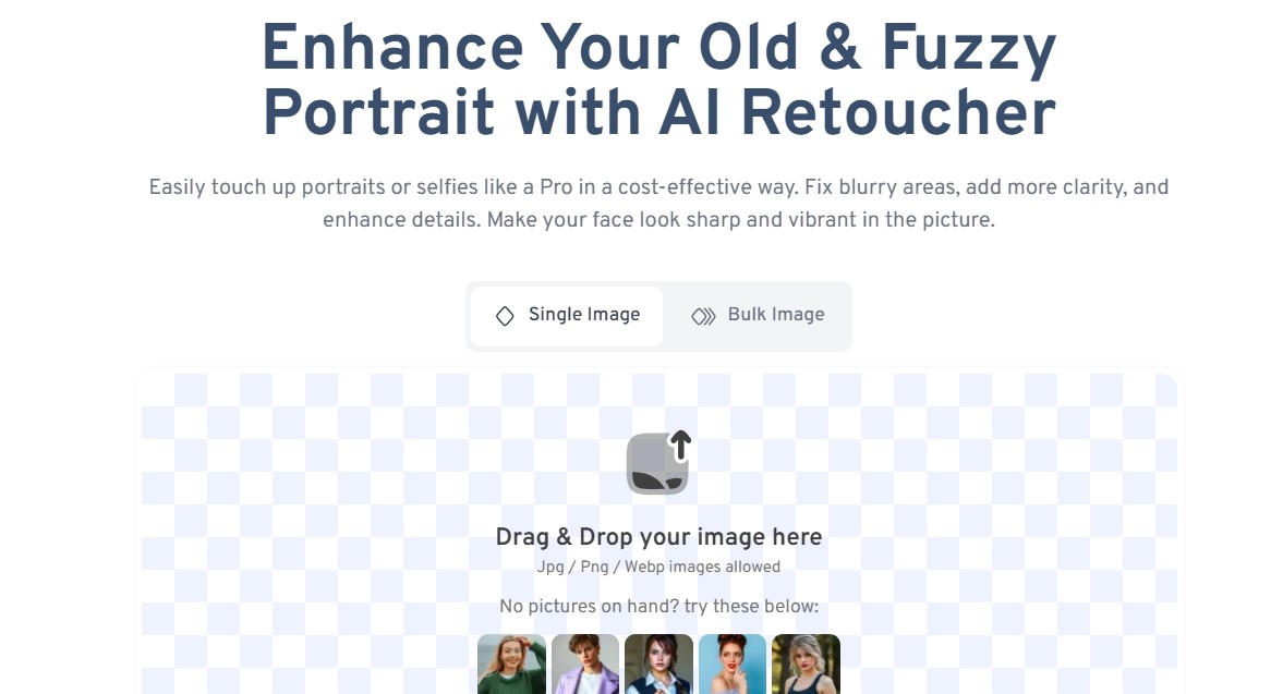 Una vez registrado, selecciona las fotos de retrato que deseas mejorar. Puedes arrastrarlas y soltarlas en el área de carga o hacer clic para subirlas desde tu computadora. Asegúrate de que las imágenes estén en formato JPG o PNG y que cumplan con el tamaño máximo de 1MB o 1200 píxeles.