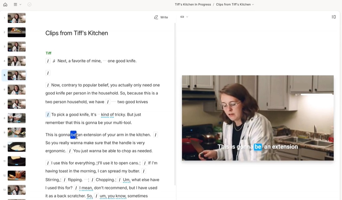 Descript se destaca por una serie de características que facilitan la edición de video y audio, transformando tareas complejas en procesos simples y eficientes. Por ejemplo, la edición de videos en Descript es tan sencilla como editar texto. Puedes cortar, recortar y reorganizar clips con facilidad, lo que hace que la producción de videos sea rápida y accesible.