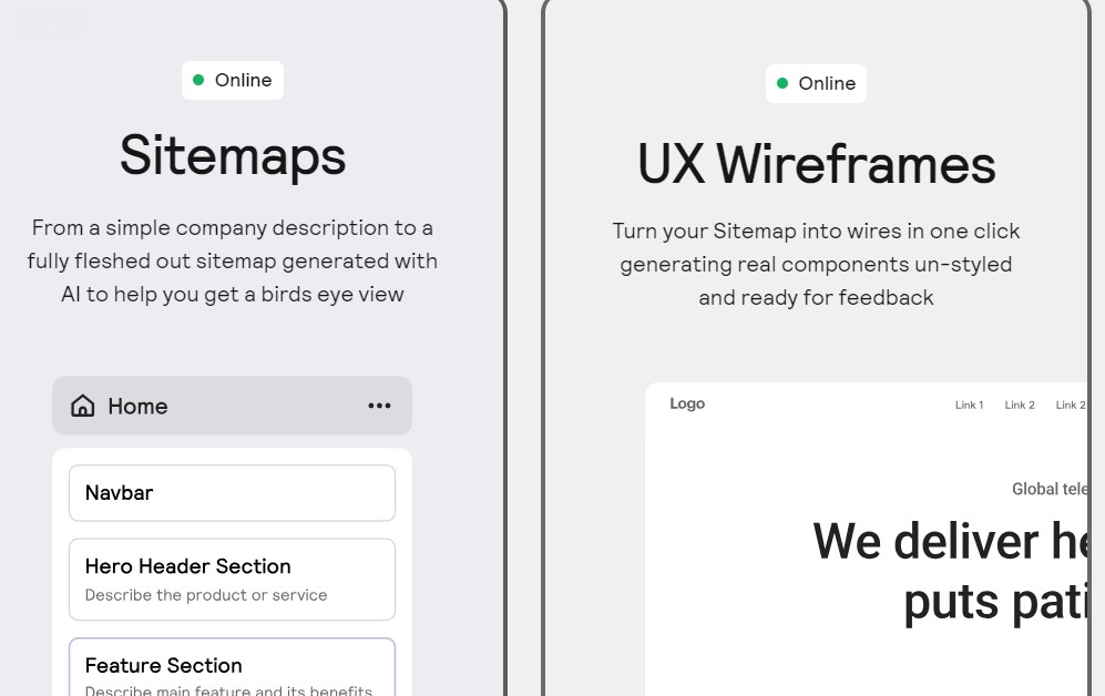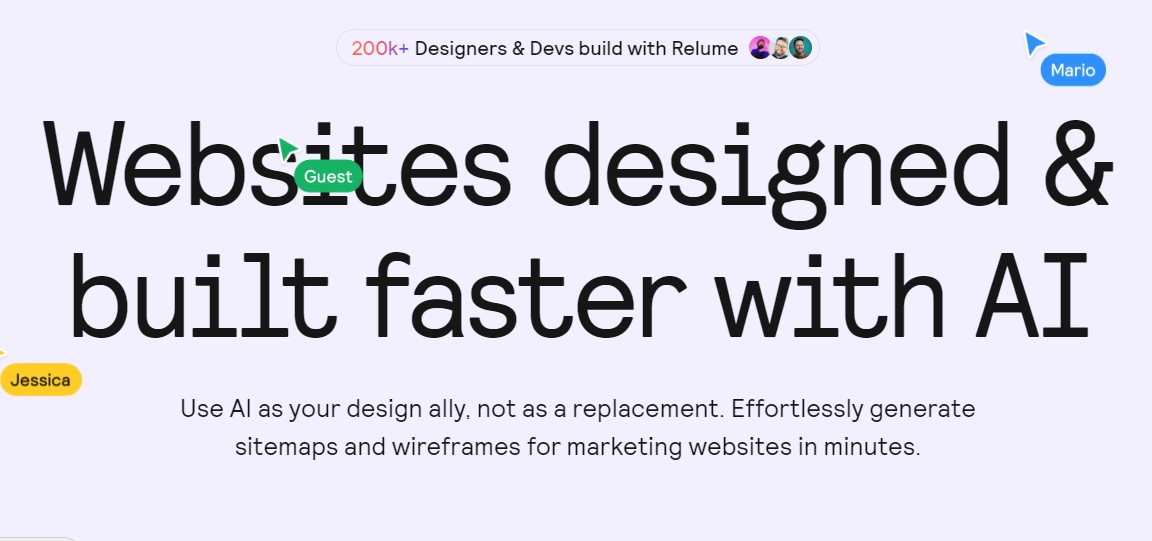 Relume ofrece un conjunto de herramientas poderosas que facilitan cada etapa del diseño web. Entre sus características más destacadas se encuentra el generador de sitios web con IA, que transforma descripciones sencillas en mapas de sitio y wireframes detallados.