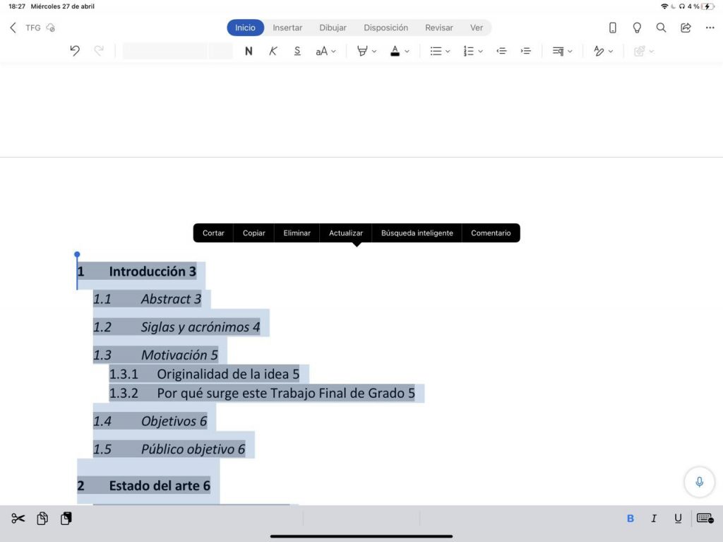 Realmente, no es posible crear un índice de contenidos en Word para iPads. Parece que la interfaz de iOS cuenta con ciertas limitaciones en cuanto a funcionalidades y esta, desgraciadamente, es una de ella.
