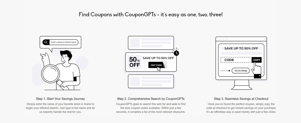 También, facilita un proceso de ahorro en tres pasos: inicia tu búsqueda de ahorros, permite que CouponGPTs realice una búsqueda exhaustiva, y disfruta de los ahorros sin complicaciones al finalizar la compra.