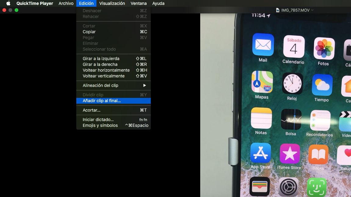 - Una vez abierto volveremos a seleccionar en el menú superior de Quicktime la opción «Edición«.