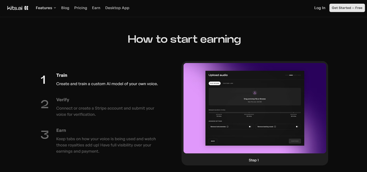 Simplemente sube una breve grabación de muestra a Kits AI. La herramienta analizará la grabación y creará una réplica digital realista de la voz. Este proceso es rápido y garantiza una alta precisión en la reproducción del timbre y las características vocales.