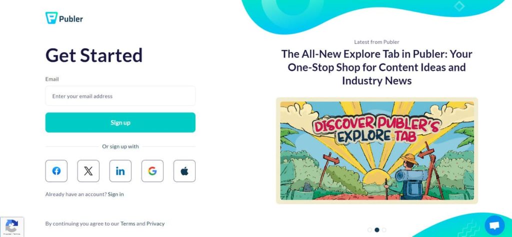 Para empezar a usar Publer, primero crea una cuenta en su plataforma. Este paso es rápido y sencillo, permitiéndote acceder de inmediato a las herramientas y funcionalidades que Publer ofrece.